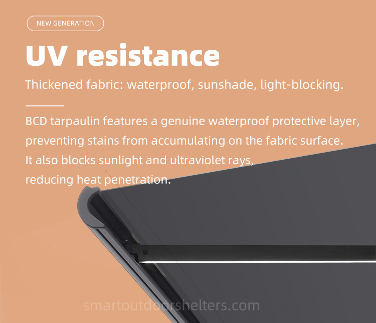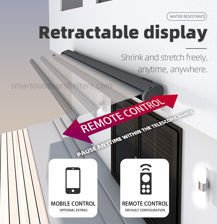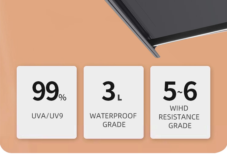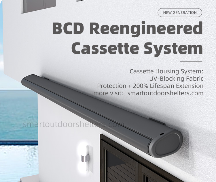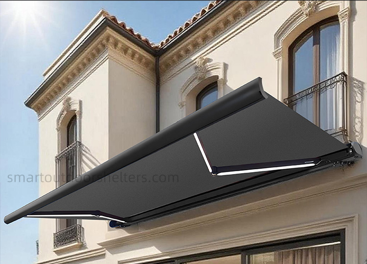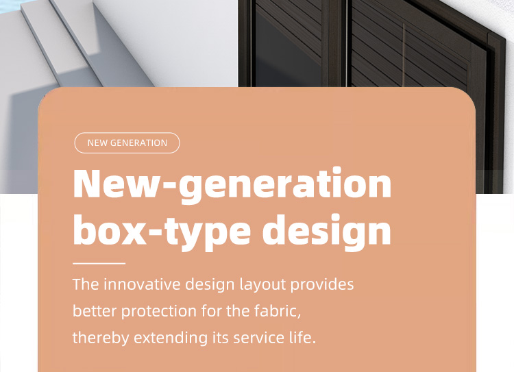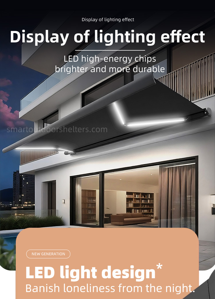 New-generation box-type retractable awning๏ผŒSubverting traditional designs, the new-generation box-type structure features an upgraded sunshade and rainproof awning fabric. With aluminum alloy baking paint technology, it is more corrosion-resistant and durable. The all-aluminum alloy outer box ensures longer service life and stronger protection.Optional functions include LED lights, wind sensors, and remote control via mobile APP.