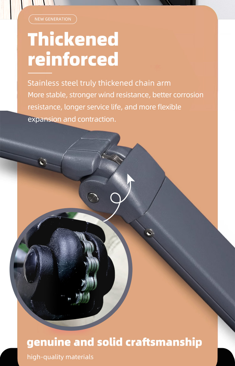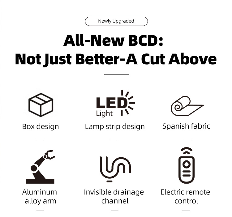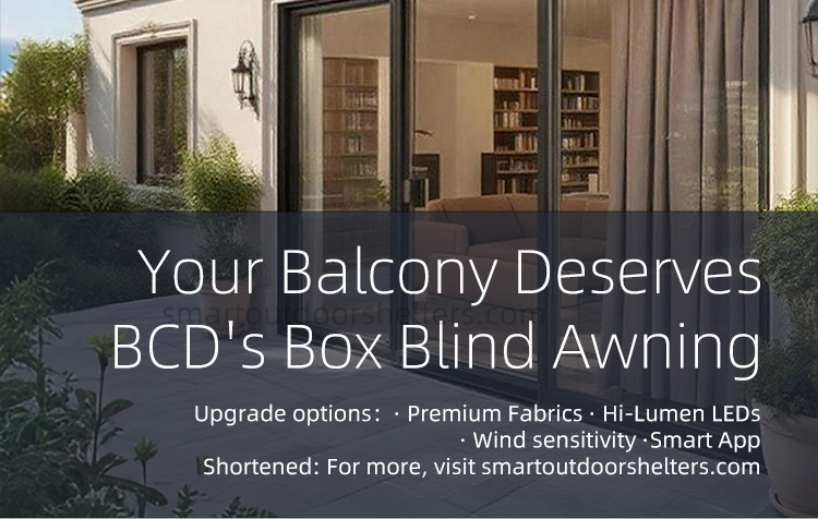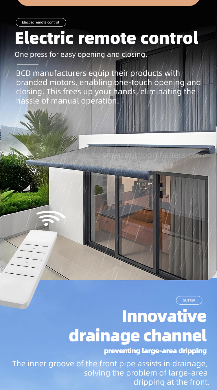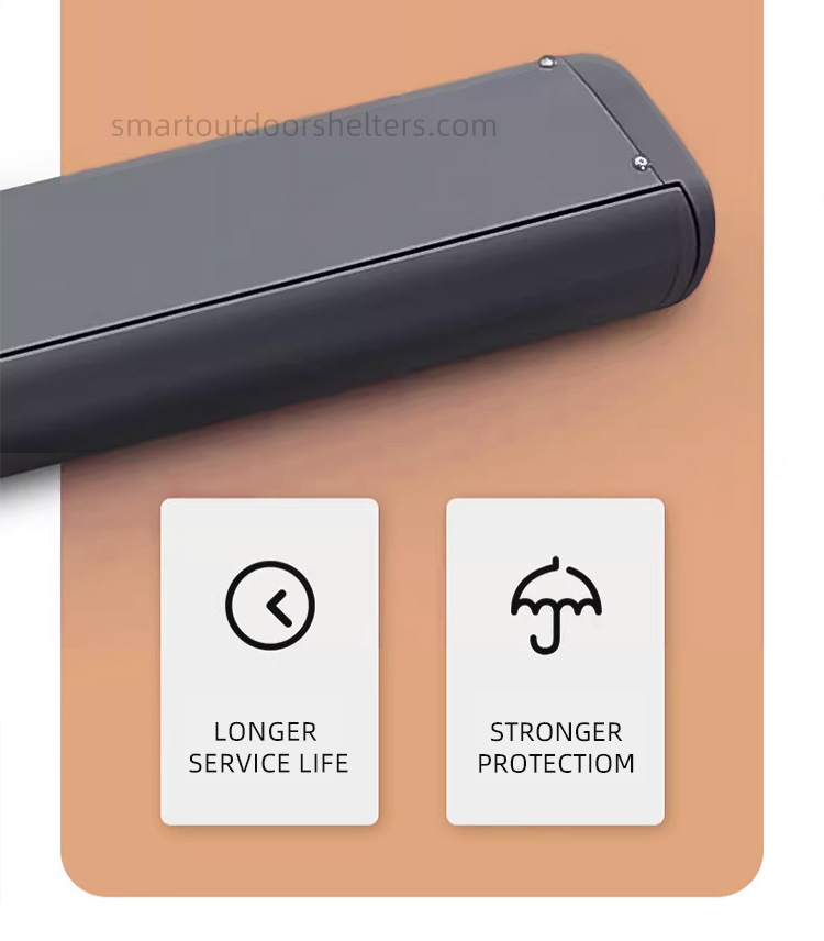 New-generation box-type retractable awning๏ผŒSubverting traditional designs, the new-generation box-type structure features an upgraded sunshade and rainproof awning fabric. With aluminum alloy baking paint technology, it is more corrosion-resistant and durable. The all-aluminum alloy outer box ensures longer service life and stronger protection.Optional functions include LED lights, wind sensors, and remote control via mobile APP.