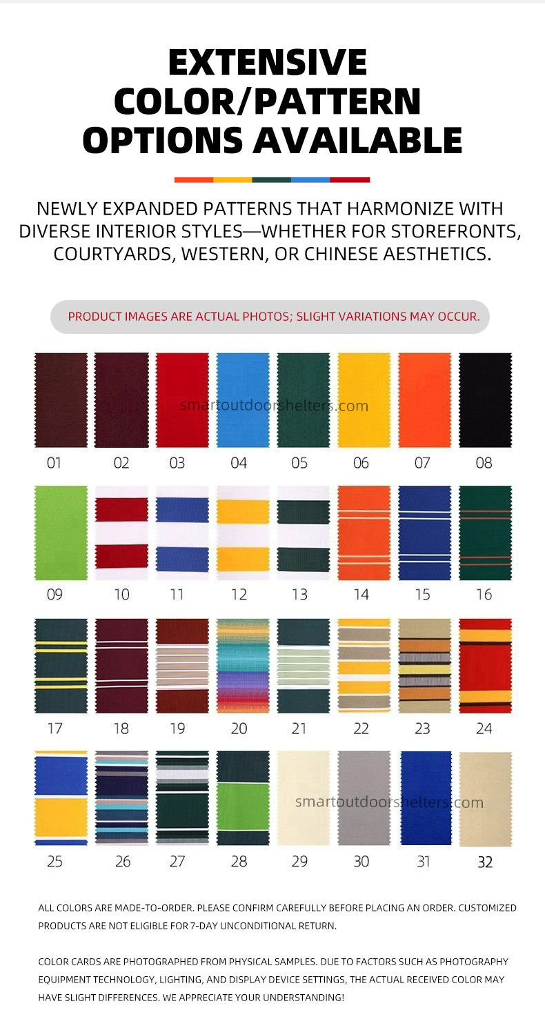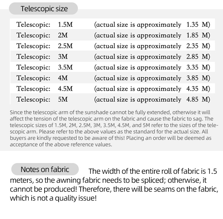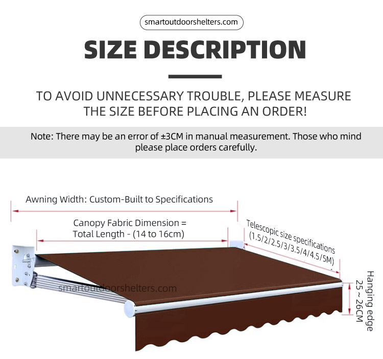 Awning Specs | 2.0m*1.5m, 3.0m*1.5m, 3.0m*2.0m, 3.0m*2.5m, 4.0m*1.5m, 4.0m*2.0m, 4.0m*2.5m, 4.0m*3.0m, 4.0m*3.5m, 5.0m*1.5m, 5.0m*2.0m, 5.0m*2.5m, 5.0m*3.0m, 5.0m*3.5m, 5.0m*4.0m, 6.0m*1.5m, 6.0m*2.0m, 6.0m*2.5m, 6.0m*3.0m, 6.0m*3.5m, 6.0m*4.0m, 7.0m*1.5m, 7.0m*2.0m, 7.0m*2.5m, 7.0m*3.0m, 7.0m*3.5m, 7.0m*4.0m |
